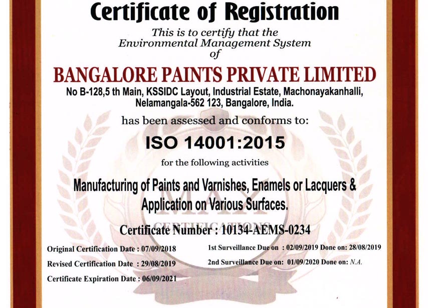 Bangalore Paints Private Limited (BPL) - ISO 9001:2015, was established in 1980 and is managed by the Shroff Group, which is a well-established group with diversified ac- tivities in trading, manufacturing and contracting. BPL, at its factory at Nelamangala, Rural Bangalore, manufactures the entire range of decorative paints - internal and external, masonry finishes and special industrial formulations paints/coatings.